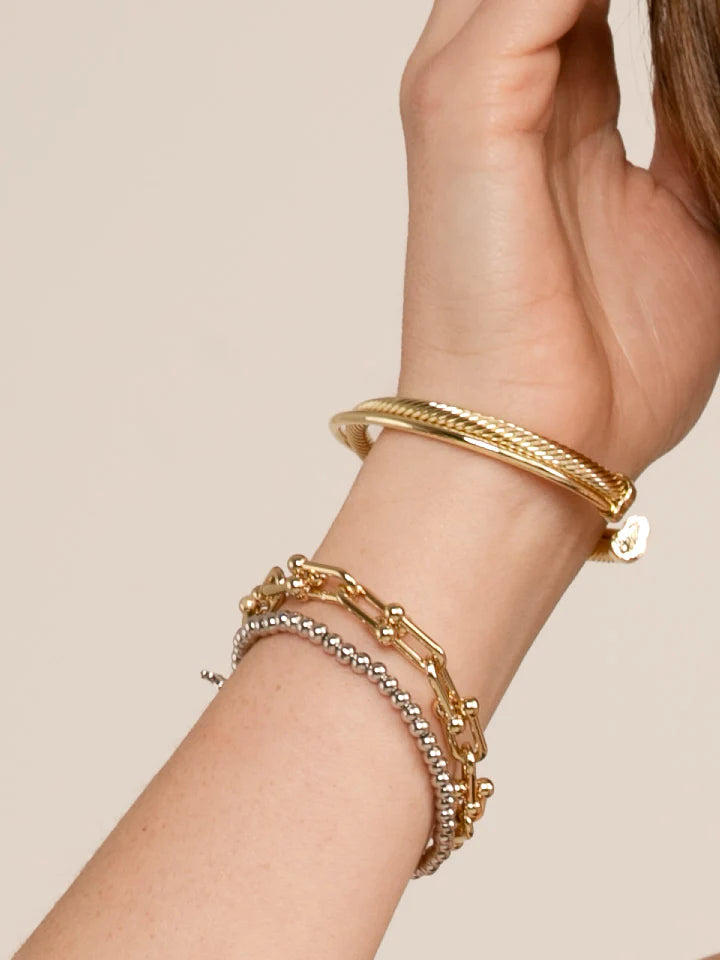 The "Pixie" bracelet is a timeless staple with a playful twist. Featuring 4mm 18k gold or rhodium triple-plated metal beads, this stretch bracelet is perfect to wear solo for subtle elegance or stacked for a chic, layered look.